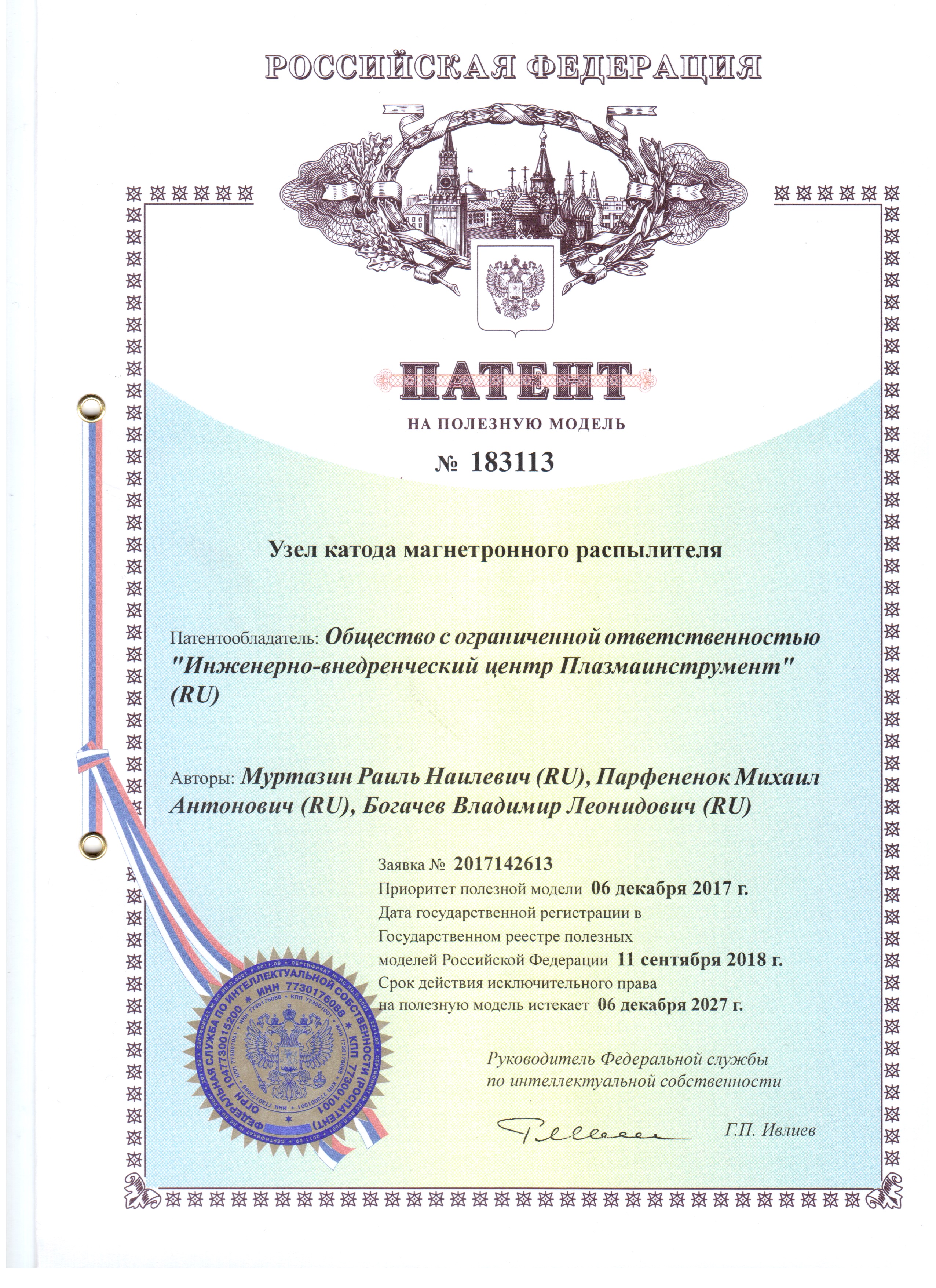 Стадия проекта: Изготовлен опытный образец, получены технико-экономические параметры, зарегистрирован патент на полезную модель № 183113 "Узел катода магнетронного распылителя".